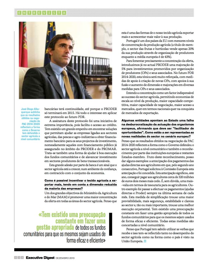 “A poucas semanas de entrar em vigor a Política Agrícola Comum para 2014-2020, José Diogo Albuquerque, secretário de Estado da Agricultura, explica de que forma é que o Governo negociou a nível europeu para garantir condições de financiamento capazes de «continuar a aumentar a produção, aumentar as exportações e tornar a agricultura uma opção cada vez mais atractiva para os jovens».”